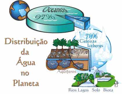 Quase toda a água do planeta está concentrada nos oceanos. Apenas uma pequena fração (menos de 3%) está em terra e a maior parte desta está sob a forma de gelo e neve ou abaixo da superfície (água subterrânea). Só uma fração muito pequena (cerca de 1%) de toda a água terrestre está diretamente disponível ao homem e aos outros organismos, sob a forma de lagos e rios, ou como umidade presente no solo, na atmosfera e como componente dos mais diversos organismos.
