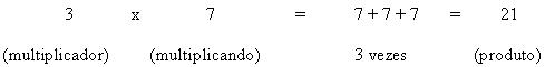 Os fatores a e b também recebem as denominações multiplicador e multiplicando. O multiplicador indica o número de vezes que o multiplicando será adicionado. Assim, no produto 3 x 7, temos: