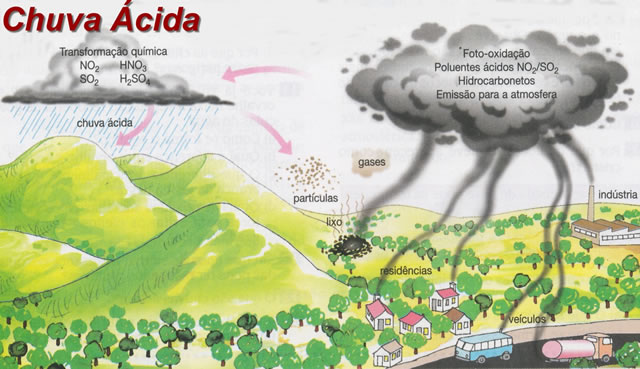 A chuva ácida é uma das principais conseqüências da poluição do ar. As queimas de carvão ou de petróleo liberam resíduos gasosos, como óxidos de nitrogênio e de enxofre. A reação dessas substâncias com a água forma ácido nítrico e ácido sulfúrico, presentes nas precipitações de chuva ácida.