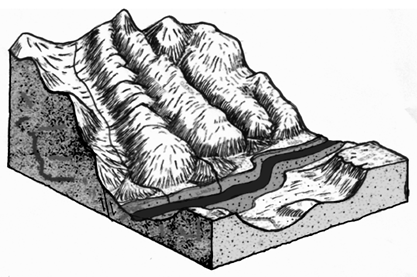 “Quando as pressões são exercidas de forma horizontal sobre as camadas de rochas mais elásticas, provocam o encurvamento das camadas rochosas, os dobramentos ou dobras, podendo formar montanhas e cordilheiras. Os movimentos horizontais são chamados de orogenéticos. Uma dobra é formada de duas partes: a côncava ou sinclinal e a convexa ou anticlinal” (Coelho, Marcos A. e Terra, Lygia. Op. cit. p. 83).