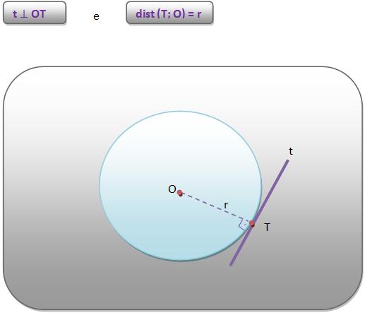 Considerando a reta t, como sendo a tangente à circunferência de centro O e raio r no ponto de T, logo t é perpendicular a OT e a distância do ponto O à reta t é igual a r.