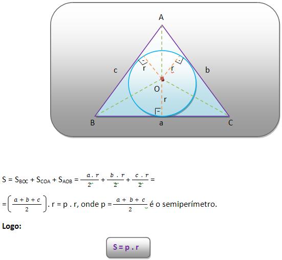 Considerando a área S de um triângulo ABC, podemos dizer que o raio da circunferência inscrita mede r, onde a, b e c são as medidas dos lados do triângulo ABC. Com isso podemos calcular sua área, juntando assim as áreas dos triângulos BCO, COA e AOB.