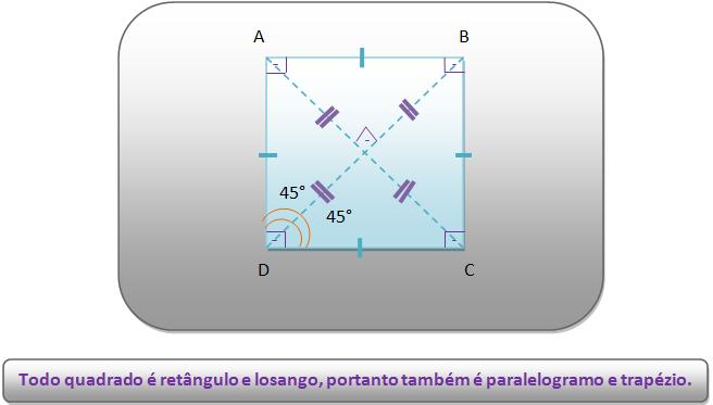 Quadrado Redação 14 anos atrás Quadrado Todo quadrilátero que é retângulo e losango ao mesmo tempo é denominado quadrado. Pela Web