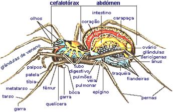 Os seres que compõem a classe Arachnida são óctópodes (4 pares de patas) e áceros (não possuem antenas). Seu corpo é dividido em cefalotórax e abdômen.