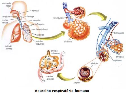 O ar entra pelas narinas ou pela boca e chega aos pulmões. É aí que ocorrem as trocas dos gases, ou seja, o sangue recebe o oxigênio que será levado a todas às partes do corpo, deixando o gás carbônico que será eliminado.
