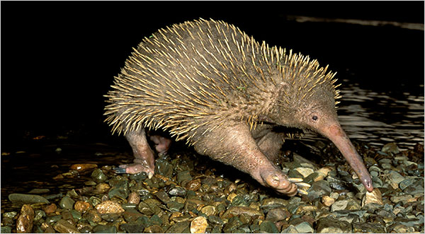 É um parente dos ornitorrincos que compartilha com este somente a característica de botar ovos e o fato de serem ambos, mamíferos. Possui um corpo que mais se assemelha ao de um gambá, com espinhos no dorso todo e com um focinho mais parecido com o dos tamanduás. É natural de regiões da Indonésia e da Papua Nova Guiné. Há 3 subespécies conhecidas, além de outras 2 que já se encontram extintas. Hoje, essas 3 subespécies se encontram em risco de extinção. É um animal de hábitos noturnos que se alimenta preferencialmente de minhocas e insetos que caça no chão da floresta.