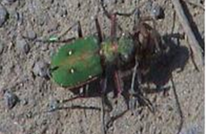 Nome científico:Cicindela campestris Tem o comprimento de 2 cm e possui antenas articuladas. A larva se transforma em crisálida após 18 meses tendo o seu desenvolvimento em 14 dias. A larva do besouro-tigre fica alojada esperando por sua presa. Ela se enterra num buraco cavado na areia, bloqueia a entrada com a sua cabeça grande e espera por insetos descuidados. Quando sua presa, cai dentro do buraco, ela afasta a areia dos pés da vítima que acaba escorregando lentamente em direção à sua boca. Este inseto na sua fase adulta é feroz e, como a larva, possui um par de mandíbulas entrecruzadas que tem a forma de foice, voando rapidamente se alimenta de outros insetos. Este inseto só é ativo em clima quente. |