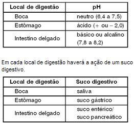 A digestão depende de fatores químicos importantes como, por exemplo, o pH. Existem 3 locais do sistema digestório onde ocorre digestão, e em cada um deles o pH é diferente.