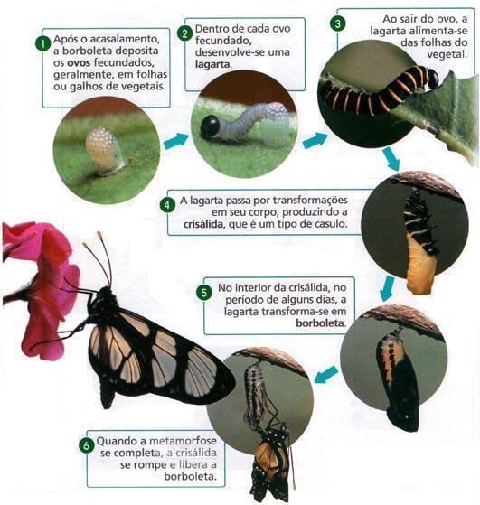 Para as borboletas e mariposas, as fases da metamorfose são denominadas: ovo → lagarta → crisálida → adulto.