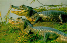 Os jacarés são répteis carnívoros muito semelhantes ao crocodilo. O que os diferencia é que os jacarés possuem a cabeça mais curta e larga e também possui membranas interdigitais nos polegares traseiros. Podem pesar até 80 kg e atingir 5m de comprimento.