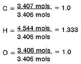 A quantidade relativa de mols de carbono e oxigênio parece ser igual, mas a quantia relativa de hidrogênio é mais alta. Considerando que não podemos ter “átomos fracionários” em um composto, nós precisamos normalizar a quantia relativa de hidrogênio para ser igual a um inteiro. 1.333 é 1 + 1/3, assim se multiplicarmos as quantias relativas de cada átomo por ‘3’, deveremos obter valores inteiros para cada átomo.