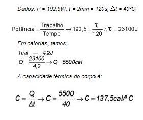 02. Sob uma chama constante, de potência 192,5W, um corpo sofre um aumento de temperatura de 40°C em 2min. Determine, em cal/°C, a capacidade térmica desse corpo. Considere 1cal = 4,2J.