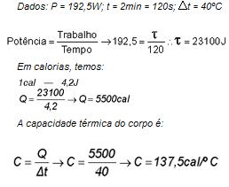02. Sob uma chama constante, de potência 192,5W, um corpo sofre um aumento de temperatura de 40°C em 2min. Determine, em cal/°C, a capacidade térmica desse corpo. Considere 1cal = 4,2J.