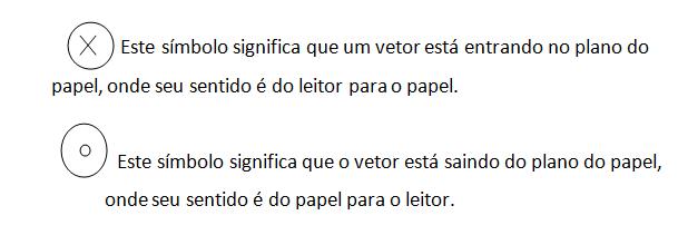 Para representar um vetor que possui uma direção perpendicular em relação ao plano do papel, existem dois símbolos, vejamos cada um deles e o que eles representam: