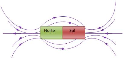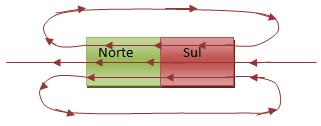 Considerando os pólos como norte e sul, podemos concluir que por meio de convenção, a sua orientação será do norte para o sul, portanto podemos concluir que as linhas de indução do campo magnético, nascem no norte e morrem no sul, conforme a figura abaixo.