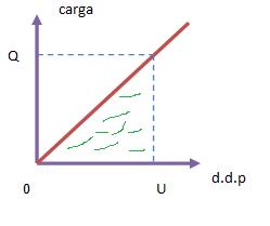 Vejamos um gráfico da carga em função da d.d.p, onde está representada a energia que está armazenada no capacitor.