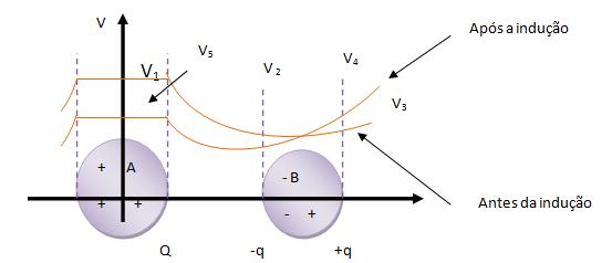 Quando a indução acaba, o potencial do indutor A, consequentemente irá diminuir, pois ele irá sofrer uma influência de algumas cargas negativas representadas por –q. Como o movimento das cargas internas do condutor foi interrompido, não será possível adquirir uma d.p entre o lado esquerdo e direito. Portanto com isso o potencial nesta mesma região irá adquirir um valor igual e constante a V4.