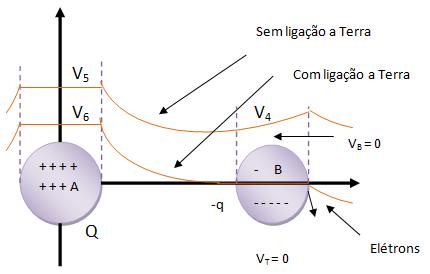 Se unirmos o induzido na Terra, seu potencial irá à zero, ou seja, seu potencial será nulo. Com isso podemos considerar a carga do induzido como –q’. Portanto a presença das cargas negativas no campo A, irão diminuir o potencial do condutor para o valor V6.