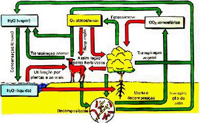 O CO2 atmosférico é utilizado no processo de fotossíntese. Os carbonos e os oxigenados presentes no gás carbônico passam a fazer parte da matéria orgânica do vegetal, e tanto a respiração como a decomposição dessa matéria orgânica restituirão o oxigênio à atmosfera, na forma de água e gás carbônico. A água utilizada pelas plantas na fotossíntese é quebrada, e seus átomos de oxigênio são liberados para a atmosfera na forma de O2.