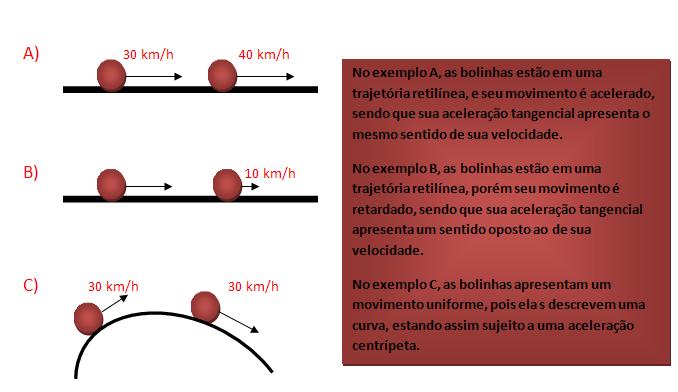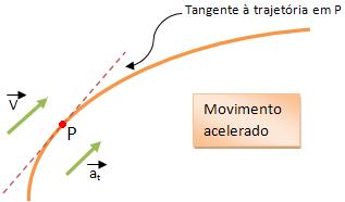 * Se o movimento for acelerado, consequentemente o módulo da sua velocidade irá aumentar e sua aceleração tangencial irá ter o mesmo sentido da velocidade vetorial.