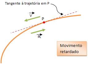 * Se o movimento for retardado, consequentemente o módulo da velocidade irá diminuir e sua aceleração tangencial irá ter o sentido oposto ao da velocidade vetorial. Vejamos: