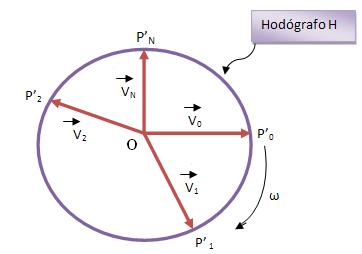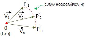O ponto P representa a trajetória L, apresentando uma velocidade vetorial variável. O ponto P’ representa uma linha H, chamada de curva hodográfica do movimento.