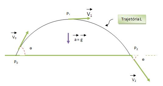 Quando falamos de movimento balístico, podemos considerar um objeto representado pela letra P, que foi lançado obliquamente, ou até mesmo horizontalmente em um campo de gravidade da Terra, supostamente uniforme, considerando g = constante. Vejamos: