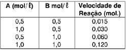 Do experimento 1 para o 3, [A] permaneceu constante e [B] foi dobrada. E a velocidade quadriplicou. Concluímos, então, que o coeficiente de [B] é 2 e a lei da velocidade é: