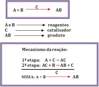 Percebe-se que o catalisador (C) fez parte da 1ª etapa da reação, porém na 2ª etapa foi regenerado. Não passou por nenhuma alteração química permanente, nem de quantidade. Também fez parte de uma etapa intermediária da reação. Possibilitou que a reação fosse realizada em novas etapas, que foram mais rápidas e que não aconteceriam sem a presença do catalisador.