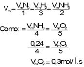 Mediu-se a velocidade da reação em determinado momento e observou-se que a amônia estava sendo queimada numa velocidade de 0,24 mol/ ls. Qual a velocidade de consumo do gás oxigênio?