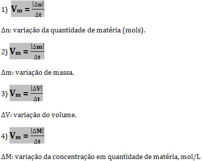 Podemos utilizar várias grandezas para calcular a velocidade média ou rapidez da reação: