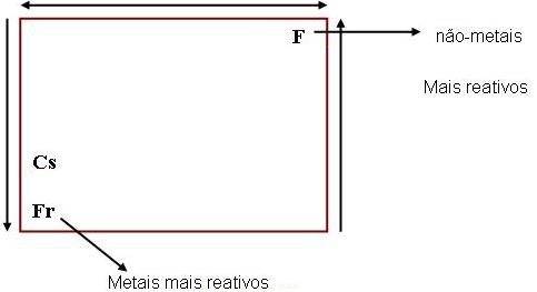 Essa reatividade dos elementos nos períodos aumenta para ambos os lados (direita e esquerda), já nos grupos é para baixo para perto do canto esquerdo, e para cima no canto direito e para cima, observe abaixo:
