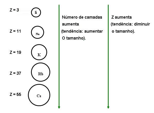 O raio atômico é considerado a metade da distância existente entre o centro de um átomo e o núcleo. Observe os exemplos dos raios atômicos dos metais alcalinos:
