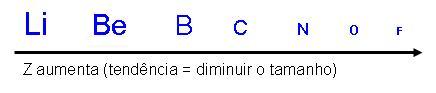 Observe que cada período de Li para f, os átomos diminuem de tamanho, pelo fato de ocorrer o aumento da carga no núcleo, e o número quântico principal não sofre alterações, portanto ele continua constante.