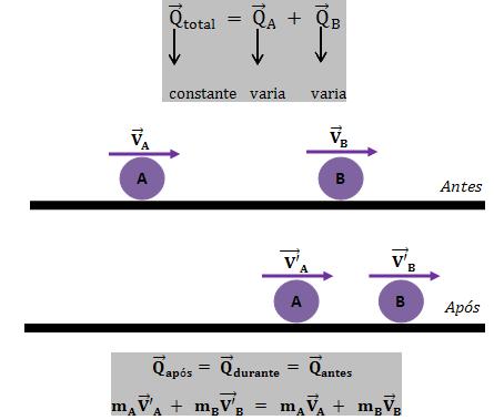 Importante: no momento da colisão, devido à presença de forças internas de ação e reação, as quantidades de movimento de cada um dos corpos são variáveis e somente a quantidade de movimento total (soma vetorial das duas) permanece constante: