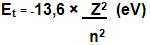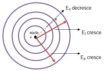 – É importante citar que a energia potencial e total crescem para a periferia do átomo e a energia cinética decresce neste sentido, Se o nível for distante a energia total é por ajuste igual a zero, o que explica o motivo do sinal de menos (-) na equação acima. Vejamos: