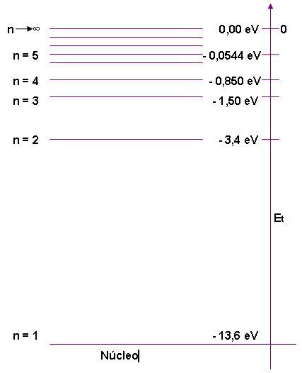 Observe abaixo, o diagrama enegético para o hidrogênio (Z = 1), estipulando para n os valores 1,2,3… , que foi concedido através da equação que concede a energia total.