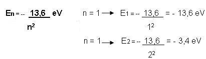 – Caso o elétron do primeiro nível receba 1 quantum de 10,2 eV, ele irá para o segundo nível. Ao voltar para o primeiro nível, lançará 1 quantum de10,2 eV.