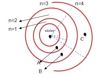 Para efetuar um salto quântico, observe a figura, se os elétrons passarem pelas posições que não são autorizadas A, B e C eles irradiaram energia.