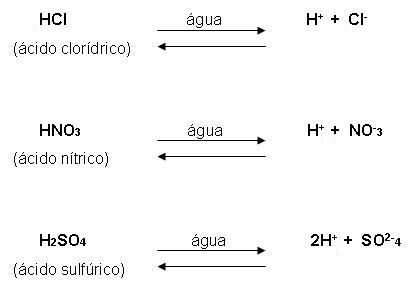 Para Arrhenius, ácidos são as substâncias que quando estão na água, são capazes de se ionizar, levando cátions para os íons hidrogênio (H+). Vejamos: