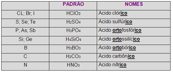 Observe que os ácidos-padrão em alguns casos têm o nome acompanhado por um prefixo (orto, grau máximo de hidratação).