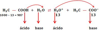 Na reação do ácido acético com água, no equilíbrio, para cada 987 moléculas não-dissociadas, temos 13 íons H3O+.
