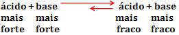 A base e o ácido mais fortes estarão do mesmo lado na equação, e o ácido e a base mais fracos ficarão do outro lado. Tal fato pode ser ressaltado através de setas de tamanhos diferentes, indicando a reação direta e inversa.