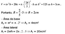 Seja V = 20cm3 o volume de um cilindro reto cujo raio mede 40 % da medida da altura. Vamos determinar o valor de sua área total.