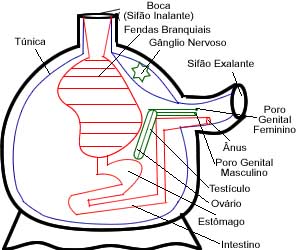 Através do sifão inalante, água que traz oxigênio, atinge a faringe e atravessa as fendas branquiais, onde acontece a hematose. A água passa para o meio externo através do sifão exalante.