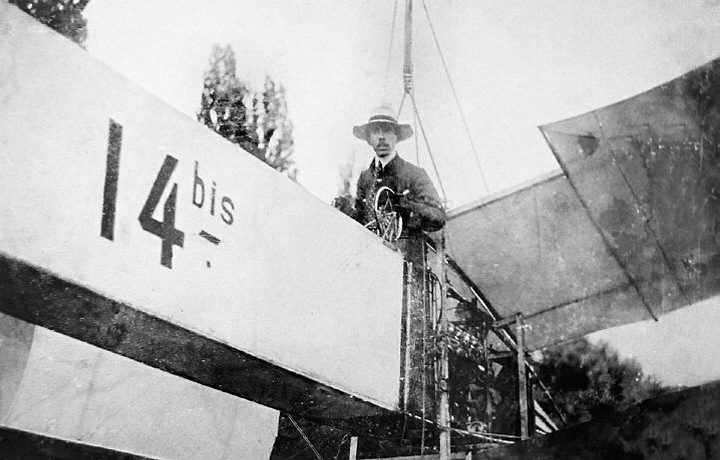 Um mês após (12 de novembro de 1906), voou em Paris a seis metros do chão ao longo de 220 metros com o 14-Bis, avião que inventou e construiu. Com este feito ganhou a Taça Archdeacom, instituída para o primeiro aeroplano que com seus próprios meios se elevasse a mais de 25 m, e o prêmio do Aeroclube da França, para o primeiro avião que fizesse um percurso de cem metros. Após o 14-bis criou, chamado hydro-glisseur (1907), com deslizador aquático, e que foi o precursor do hidroavião. Ainda aperfeiçoou o aparelho Demoiselle ou Libellule (1907-1909), uma espécie de modelo de ultraleve com hélice frontal, feito com bambu e seda que, com o piloto, pesava pouco mais de 100kg, e com um motor de 30 HP. Nele o cientista viveu seu último vôo como piloto e atingiu uma velocidade média de 96 quilômetros por hora (1909). Com a saúde declinante e vendo seu invento ser cada vez mais utilizado como instrumento bélico, começou a ter progressivas crises de depressão, agravadas a partir da Primeira Guerra Mundial.