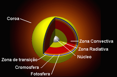 Núcleo: é o espaço que vai registrar as mais elevadas temperaturas do Sol. É o único local que será observada uma parte com produção de energia. Essa energia é armazenada em grandes quantidades a partir dos processos de fusão.