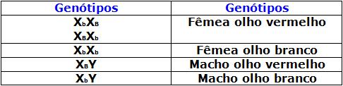 Sendo que um gene dominante (B) é responsável pela cor vermelha dos olhos, e o gene recessivo (b) responsável pela cor branca dos olhos, os genótipos e fenótipos podem ser representados da seguinte forma: