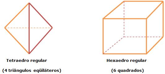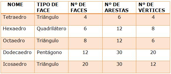 Chamamos de poliedros de Platão, quando todas as faces têm o mesmo número de lados, quando em todos os vértices coincidem o número de arestas e quando segue a relação de Euler (V – A + F =2).