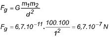 Determine a força de atração gravitacional entre dois corpos com massas de 100kg cada, separados por 1m. Considere G = 6,7 . 10-11Nm2/kg2.
